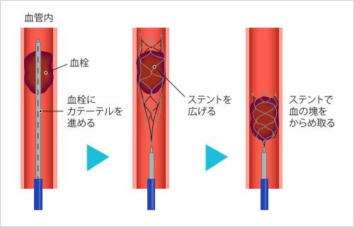 血管の詰まったところを超えてカテーテルを誘導し、ステント(金属でできた網目状の器具)を広げる。血液を吸引しながらステントで血の塊を回収する。