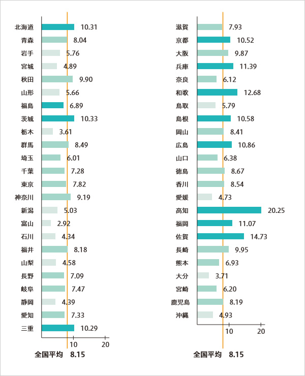この治療には都道府県格差があり、10万人あたり全国平均では8.15人ですが、突出して高い高知県では20.25人です。また同一県内でも地域格差があるのが現状です。