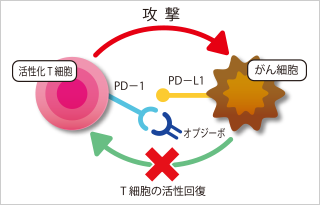オプジーボを投与すると、T細胞のPD-1とオプジーボが結合し、がん細胞との結合は外れる