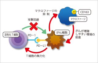 前述のとおり、がんは免疫抑制機構を逆手にとって、自らが生き延びやすい環境を整備しています。その中で重要な役割を果たすのが、マクロファージという細胞です。マクロファージは本来、細菌などを食べる細胞ですが、がん細胞のPD-L1から信号を受け取ると、本来の機能が抑制されます。