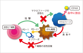 オプジーボでPD-L1を中和すると、抑制されていたマクロファージが活性化され、がん細胞を取り込むようになります。それとともに、マクロファージに含まれていたCD163というタンパク質が血中に放出されます。血中のCD163を測定すれば、オプジーボががんに作用したかどうか判断できます。